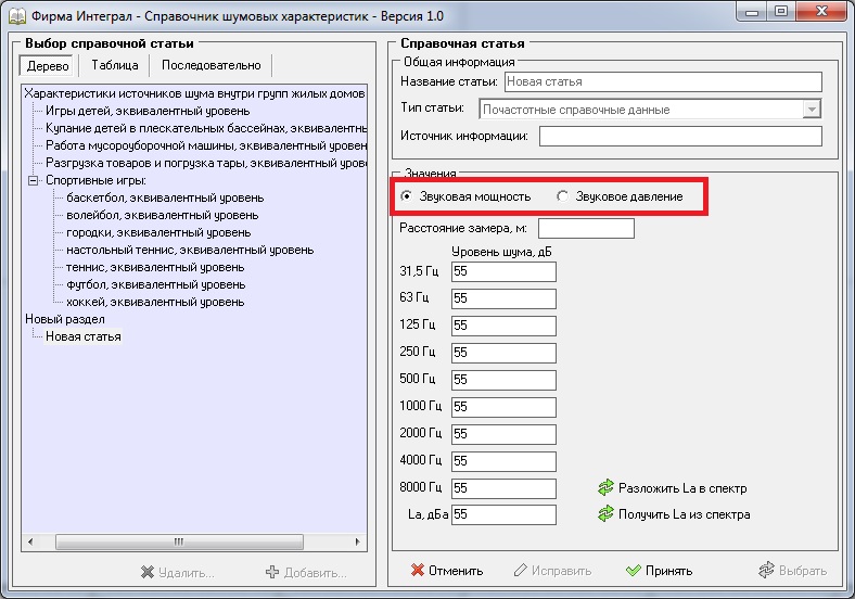 Здравствуйте! Помогите, пожалуйста, начинающему пользователю. В справочник шумовых характеристик добавила необходимые мне данные, сохранила, а теперь не могу их отредактировать. Как это сделать. И еще, в этот справочник, как я поняла, вносится звуковая мощность откорректированная по шкале А, производитель дает только максимальныу уровень шума - 70 дб (допустим). Что мы вносим в справочник, какие данные, что бы расчитать эквивалентный и максимальный шум??? Спасибо
