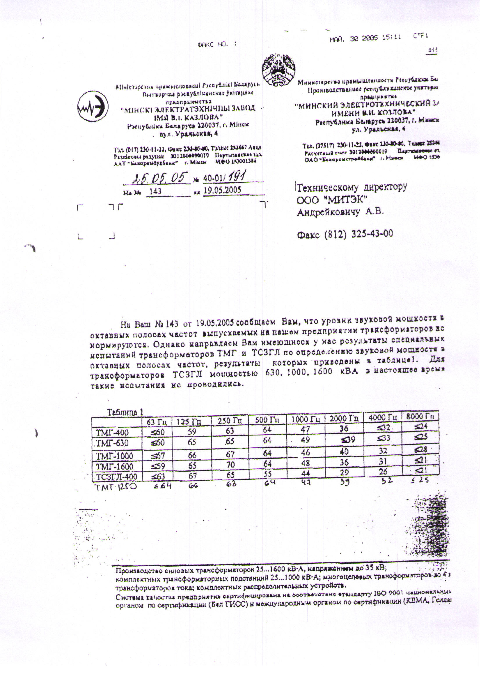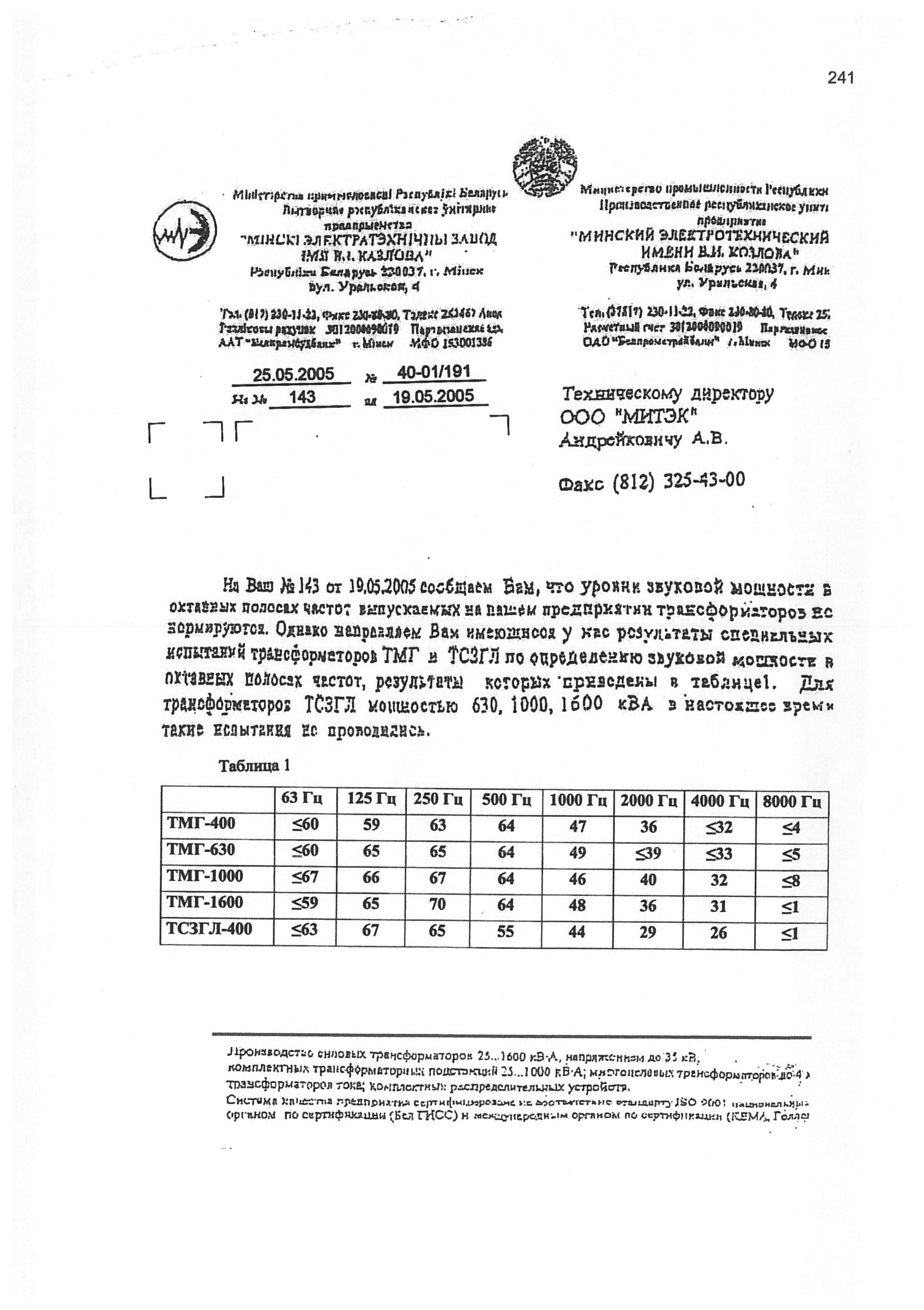 Выкопировка из каталога продукции Минского электротехнического завода им. В. И. Козлова "Силовые трансформаторы" с шумовыми характеристиками трансформаторов.