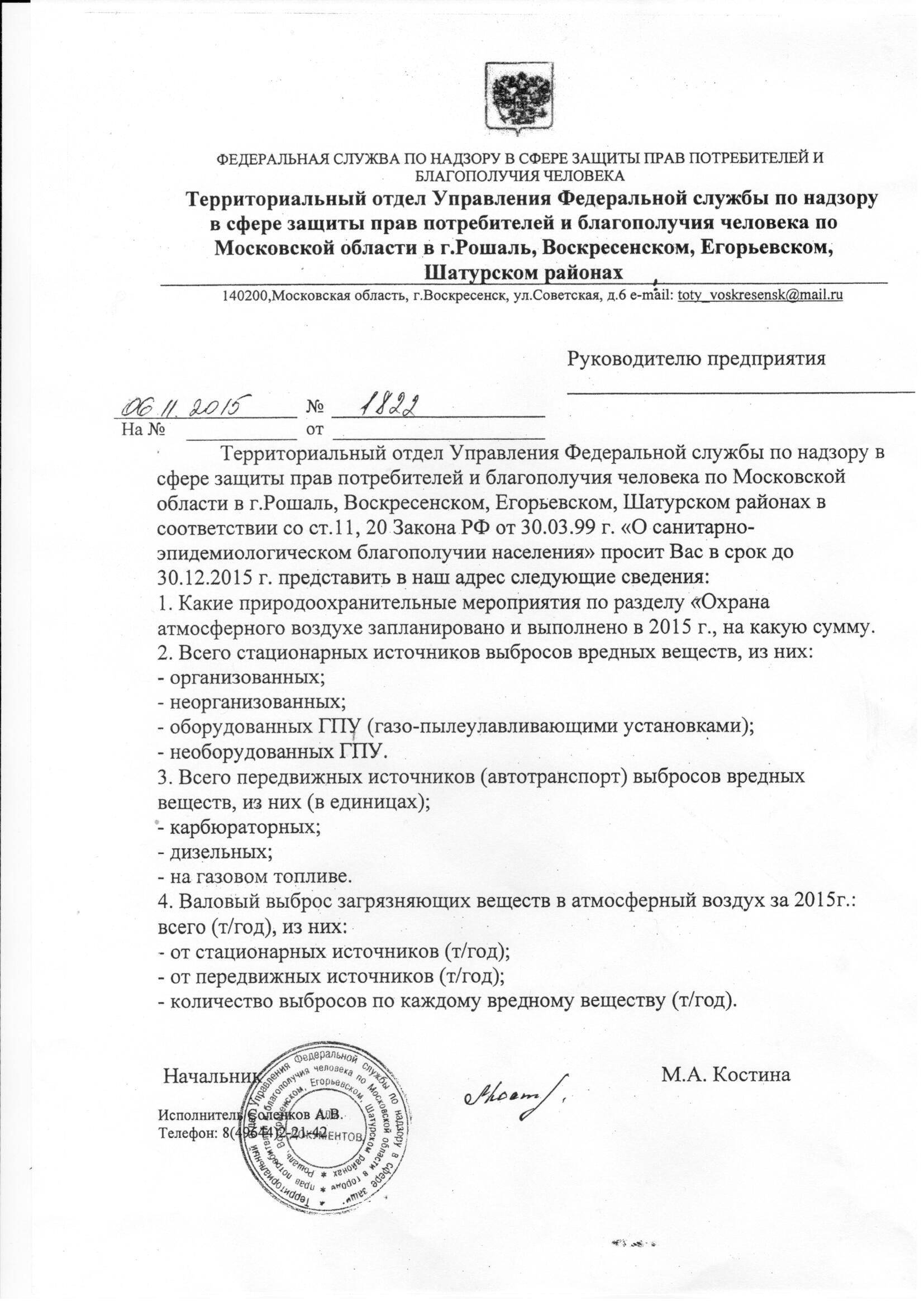 Письмо-запрос от Роспотребнадзора
