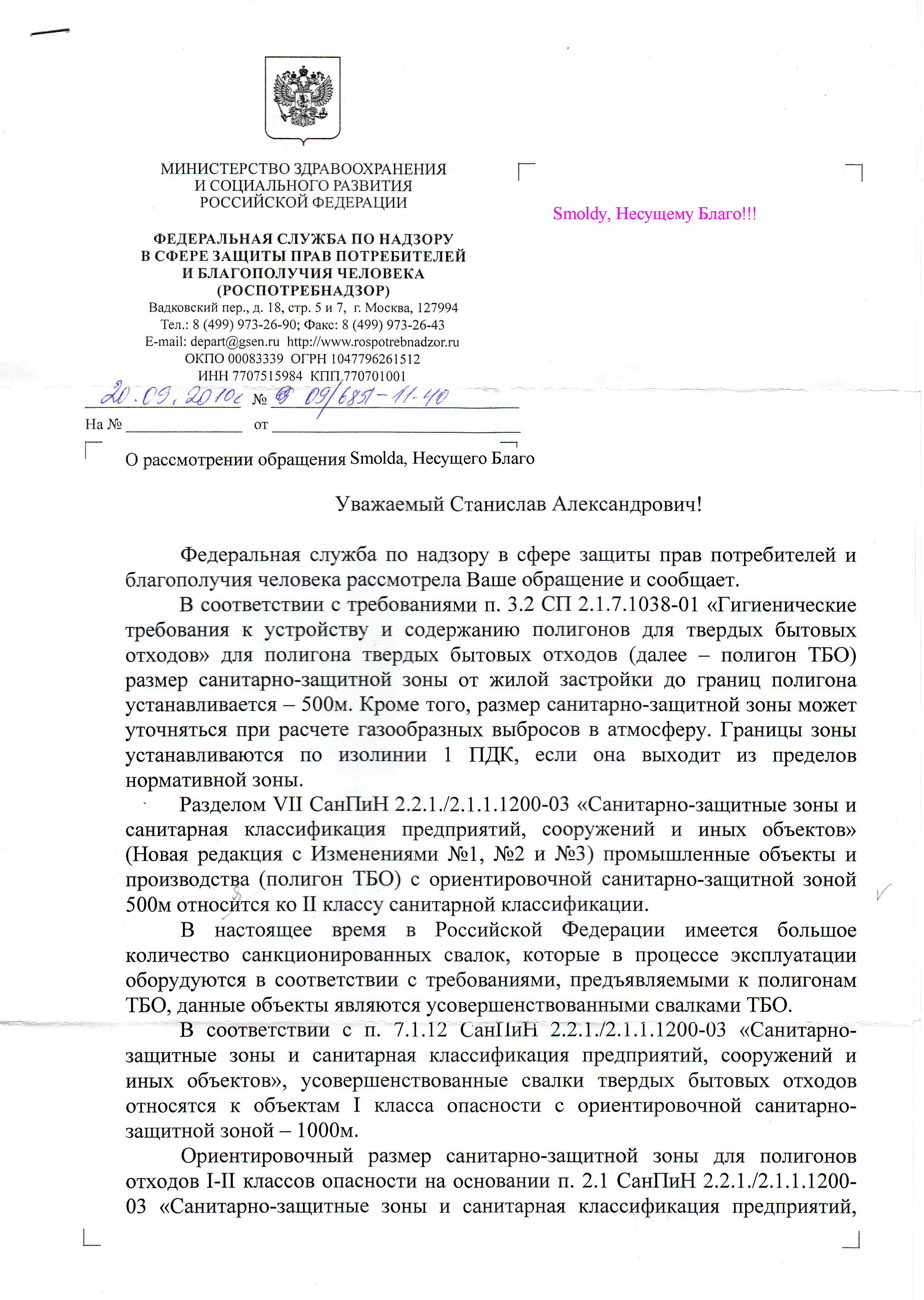 НО....наши доблестные "врачи" (заметьте не какой-то территориальный РПН, а Федеральная Служба РПН Москва) пишет, что в соответствии с СанПиН 2.2.1/2.1.1.1200-03 (с изменениями 1,2,3) ориентировочный размер СЗЗ полигона ТБО = 500 метров и относится ко 2 классу опасности!!!