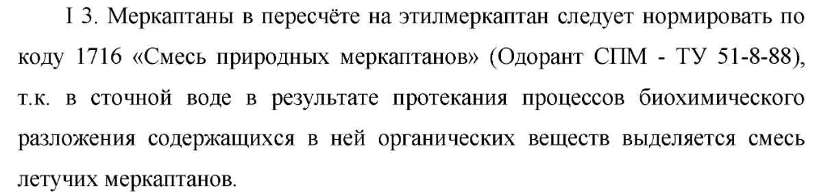 ) В связи с тем, что с тех пор как была разработана методика был изменено ПДК 1716 вещества, а также сам одорант теперь уже другой выпускается на территории РФ, некорректно нормировать по коду 1716; Считаю необходимым нормировать по коду 1728 Этантиол, во времена когда создавалась методика и переиздавалсь и разъяснения о которых Вы пишите выпускались у кодов 1716 и 1728 были одинаковые ПДК, один логичнее было использовать для чистого этантиола, другой для смеси природных меркаптанов. Также можно сослаться на методику станций аэрации 2015 года, где сказано, что нормировать надо выброс смеси меркаптанов в пересчете на этилмеркаптан, я считаючто и ГН рекомендуется брать по нему.АлександраNNN писал(а): 07 июн 2021, 14:48 я действую в соответствии с разъяснениями разработчиков методики, что не вызывало вопросов