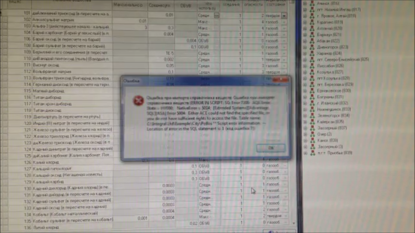 Записал видео и удалось прочитать текст ошибки, цитирую: Ошибка при импорте справочника веществ. (ERROR IN SCRIPT; SG: Error 7200; AQ: Error Stater = HY000; NativeError = 5400; [Extended Systems [Adventures SQL[[ASA] Error 5004; Either ACE could not find the specified file, or you do not have sufficient rights to access the file. Title name C:\Integral.Ltd\Exampl\City\Pollos ** Script error informations - Location of error in the SQL statement the 1 (код ошибки 7))