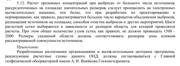 Ecolog-Julia писал(а):В соответствии с п. 5.12 ОНД-86 "... Шаги расчетной сетки выбирают в зависимости от размеров области, для которой проводятся расчеты. При этом общее количество узлов сетки, как правило, не должно превышать 1500-2000. Размеры указанной области должны соответствовать размерам зоны влияния рассматриваемой совокупности источников."