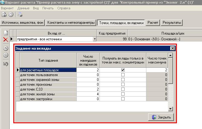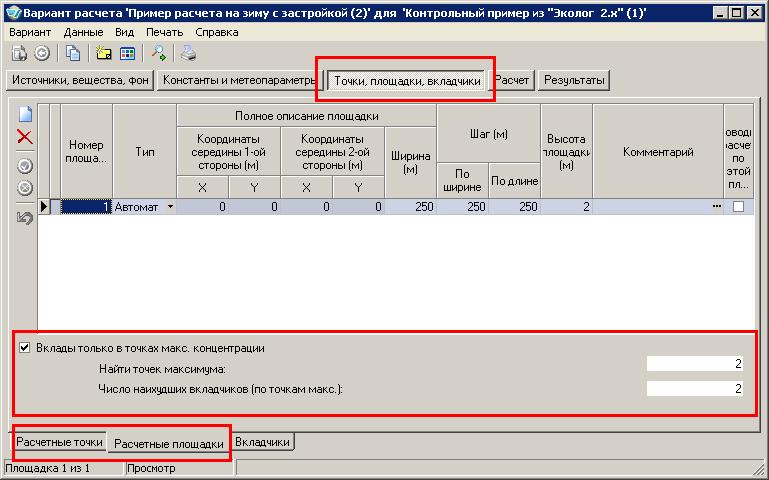 1. На стадии ввода исходных данных (при заполнении формы: окно - "Варианты расчета", закладка - "Точки, площадки, вкладчики"/"расчетные площадки") имеется возможность установить "галочку" только в единственном предлагаемом варианте: "Вклады в точках максимума".