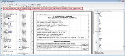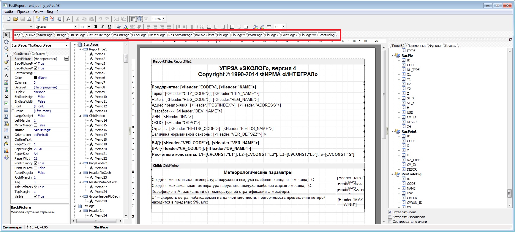 В программе используется специальный продукт по выводу отчетов - FastReport. Таблицы отчета довольно разнородны, поэтому каждая новая таблицы в данном инструменте идет как отдельный шаблонов, в который программист набирает какие данные, из каких полей будут попадать в соответствующие ячейки. Пять таблиц с разнородными данными = 5 шаблонов, которые автоматически разрываются FastReport-ом.