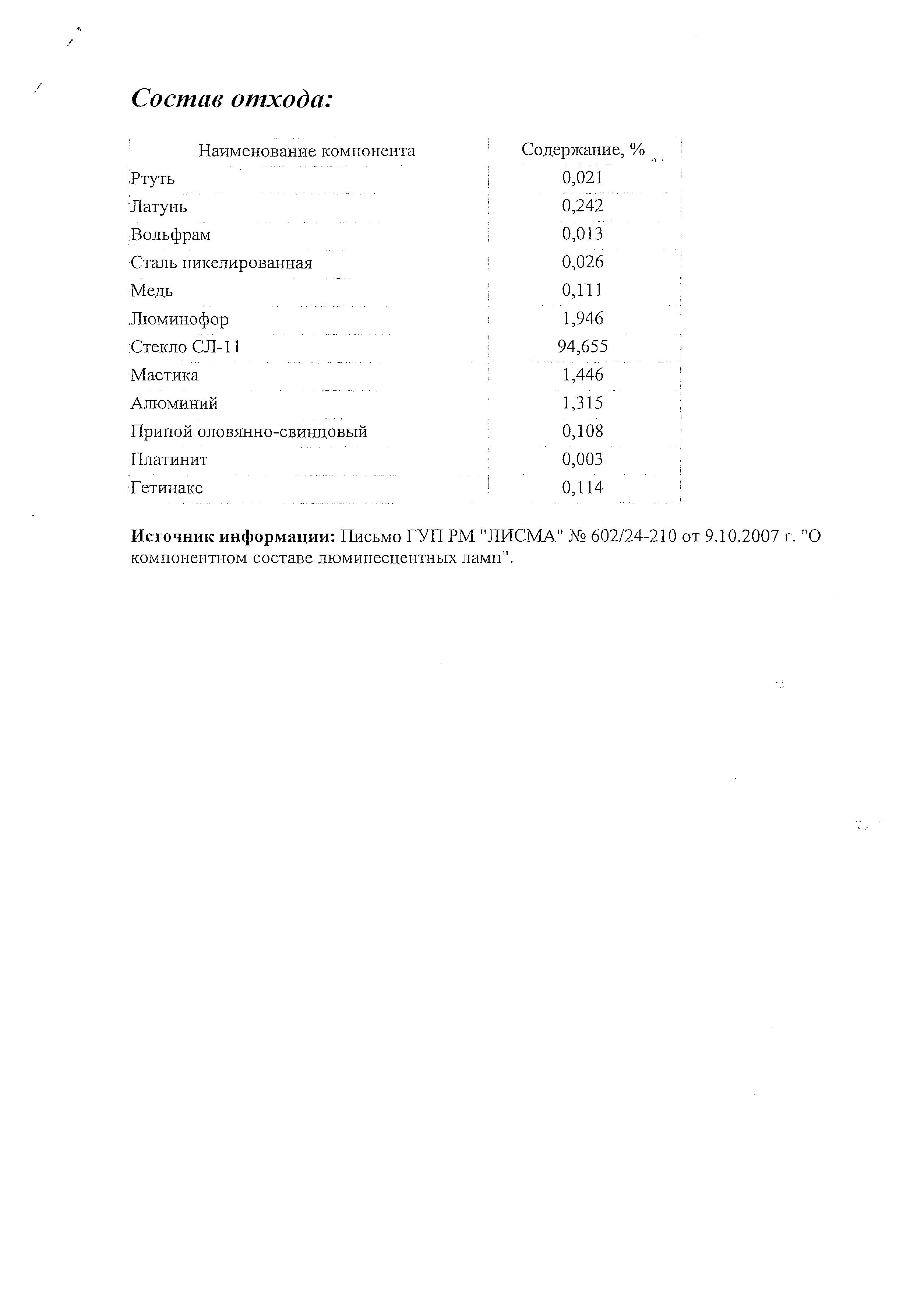 Знаю тема уже заезженная, но куда деваться.[!bh] Не мог бы кто-нибудь скинуть данные по компонентному составу данного отхода, КОНКРЕТНО НУЖНО ОТКСЕРЕННЫЙ ИСТОЧНИК с титульным листом и страницей, где указан компонентный состав. Если у кого есть методичка "Методика расчета образования отходов.Отработанные ртутьсодержащие лампы."С-П,1999 , то пришлите, пожалуйста (кажется там тоже есть). ТОЛЬКО НЕ ПРИСЫЛАЙТЕ ПРИКАЗ МПР ПО ХАНТЫ-МАНСИЙСКОМУ ОКРУГУ!!!! у нас его не принимают.[!bh]Спасибо заранее.
