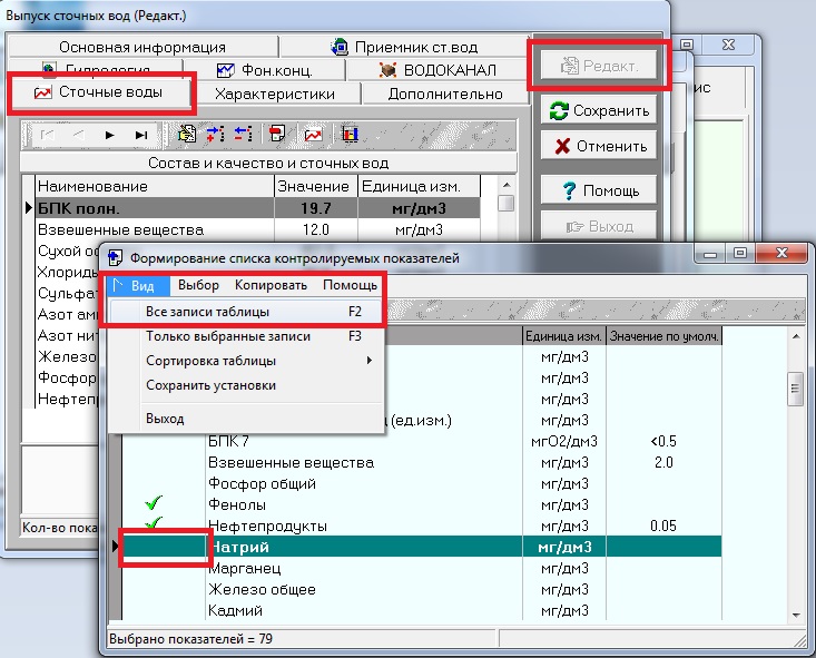 Окно "Выпуск сточных вод" - закладка "Сточные воды" - кнопка "Реадкт." - кнопка "Добавить показатели в таблицу" - меню "Вид" - "Все записи таблицы" - выбрать нужно вещество кнопкой "Insert" - меню "Копировать" - "Копировать записи".