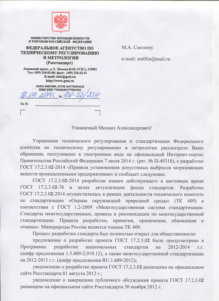 В письме также сообщается, что Минприроды РФ является членом ТК409 (технический комитет по стандартизации "Охрана окружающей природной среды"). Так что к Росстандарту никаких претензий не может быть. Но, почитав о ТК409 на сайте Росстата, не увидел в нем членства Минприроды РФ. Есть только Председатель ТК: Евдокимов Александр Сергеевич, работающий в Департаменте государственной политики и регулирования в области гидрометеорологии и мониторинга окружающей среды Минприроды РФ. А организацией, ведущей секретариат ТК, является все та же ОАО "НИИ Атмосфера".