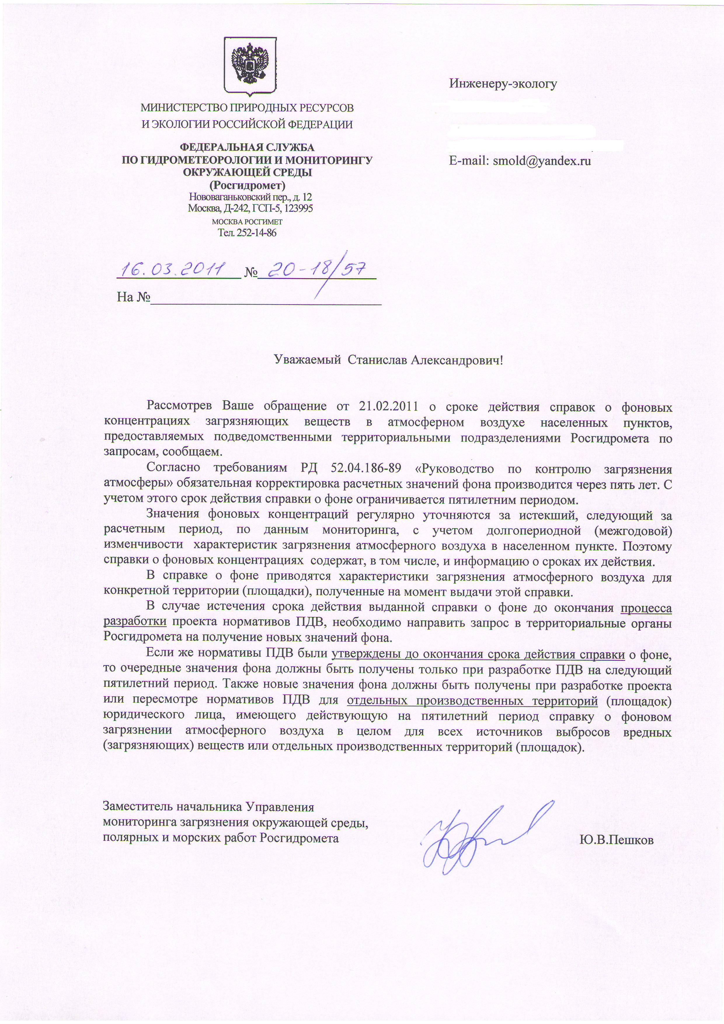 Фон должен действовать 5 лет!!!!С уважением.....kira писал(а):Пожалуйста подскажите. Какой срок действия писем гидромета по фон. концентр. и чем это регламентир. заранее спасибо!