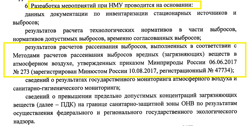 По всей видимости начитались постов и писем Выше, где нам утверждают, что расчеты рассеивания для формирования перечyя веществ, нуждающихся в мероприятиях при НМУ, должны быть проведены в соответствии с Методами, утвержденными 273 приказом.