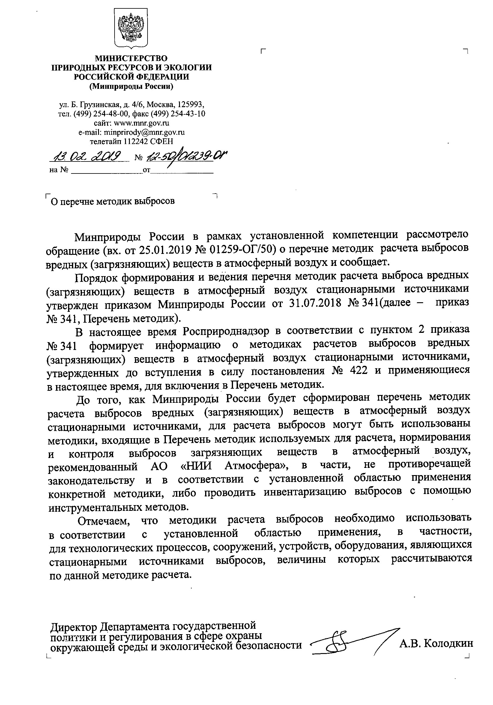 Письмо Минприроды России № 12-50/01239-ОГ от 13.02.2019 "О перечне методик выбросов"
