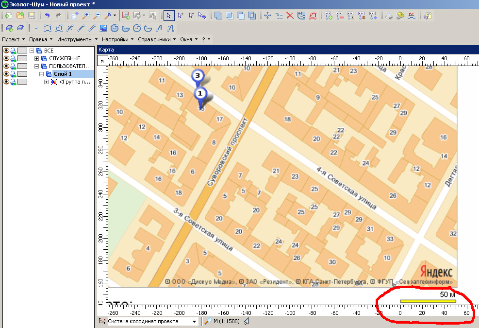 А вот результат. Видно что этот отрезок действительно в программе равен 50 метрам.