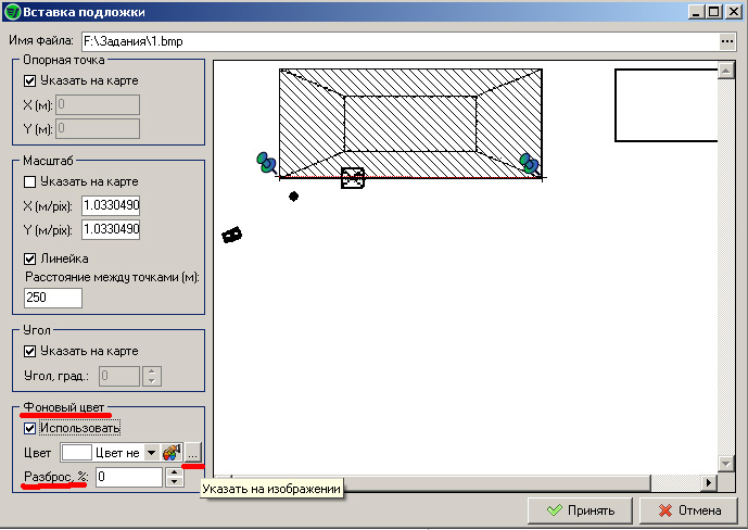 Ну а теперь о прозрачности. Пока в программе не сделаны настройки прозрачности заливки изолиний, но мы сделали возможность настроить прозрачность самой подложки. Если раньше для прозрачности требовался файл в формате BMP и сохраненный в монохромном режиме (черно-белый), то теперь вы самостоятельно можете настроить какой цвет будет прозрачным для программы. Поле "Фоновый цвет", нужно будет поставить галочку и выбрать, либо из выпадающего списка цвет, либо можно будет с помощью кнопки с изображением "..." указать на подложке цвет, который вы хотите сделать прозрачным для программы. Так же можно будет указать процент разброса этого цвета (оттенки).