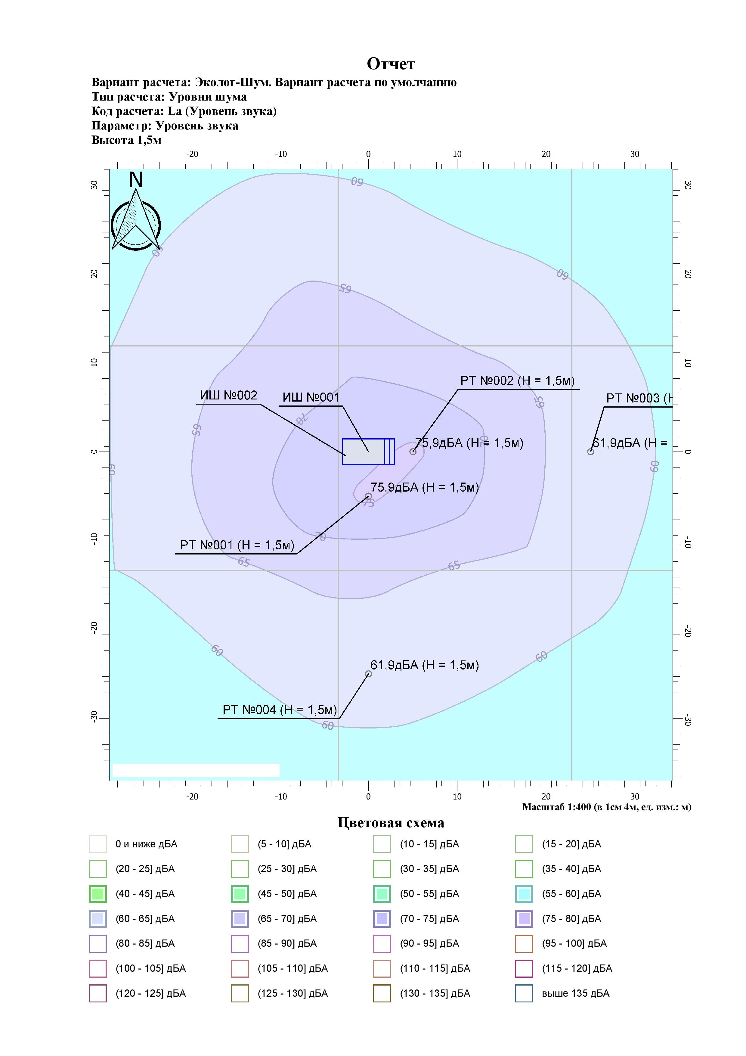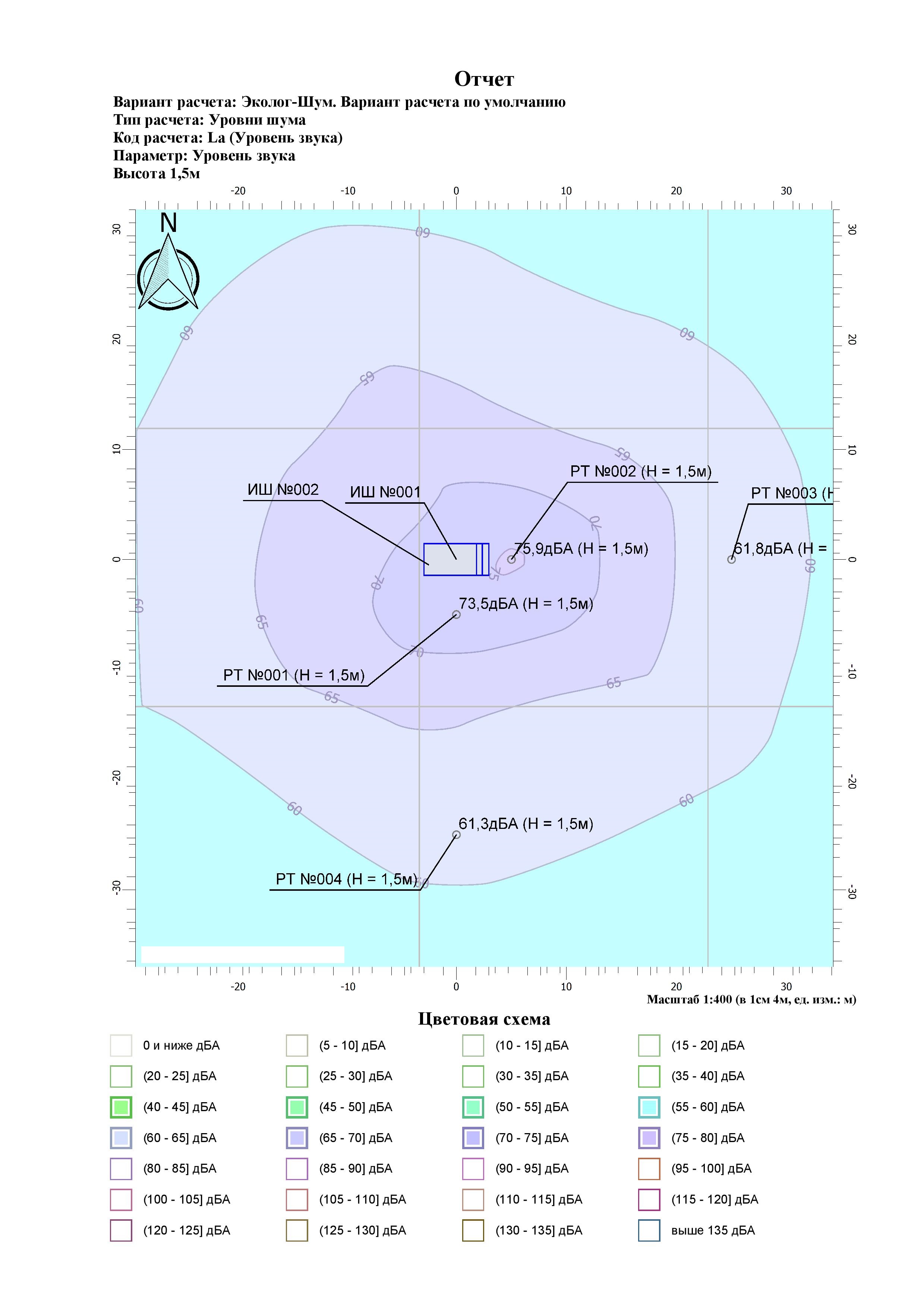 Шумовые характеристики источников одинаковые. Расчетные точки расположены на расстоянии 25 м от точечного источника.
