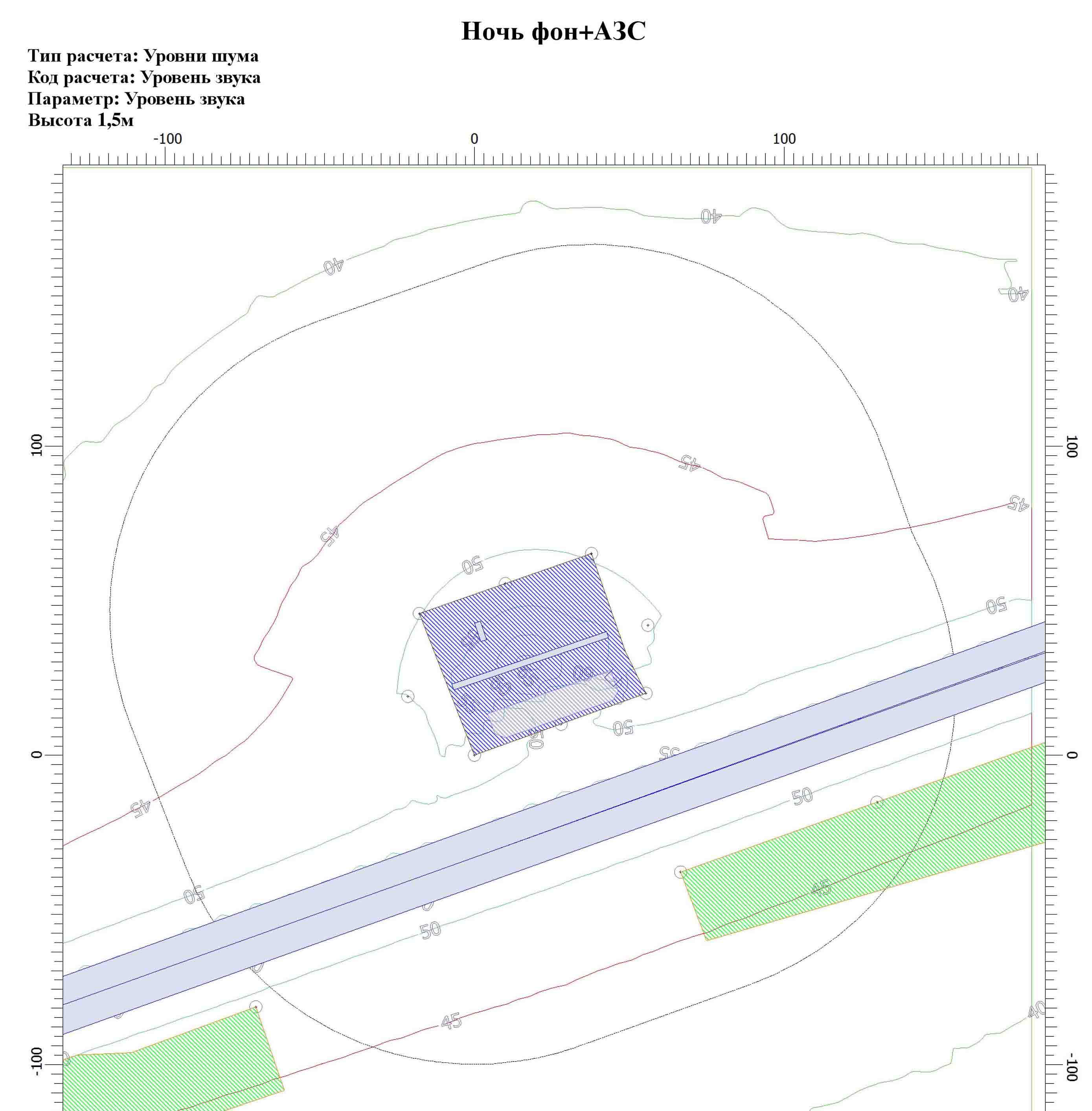 Не совсем понятно что у вас за ситуация, не видно где жилье или другие норм объекты.Я делаю следующим образом: беру расчетные точки на расстоянии указанном в санпин (если есть возможность и не надо сокращать), провожу рассеивание хим веществ, если все "ок", в этих точках провожу расчет уровня шума, если шум без фона "ок" то такой размер СЗЗ и принимаю. Если есть превышение по шуму и оно вызвано фоном, то отписываюсь что при введении в эксплуатацию проектируемого объекта акустическая обстановка в районе размещения объекта не поменяется. Скорее всего в ситуации "АЗС и автодорога" у вас основной шум от дороги, насосы заглубленные (я вообще не учитываю), шум при проезде по АЗС невелик.