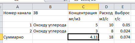 Далее зная общий объемный расход и массу выброса в нём определяем концентрацию.