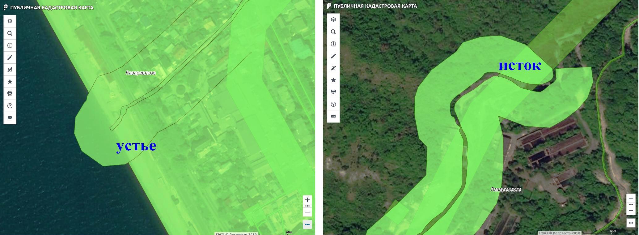 источником информации поворотных точек границ ВОЗ, которые мы видим в публичке являются бассейновые водные управления, как я понимаю, т.е., по идее те, кто как никто другой разбирается в установлении ВОЗ для ВО. Так вот, по ссылке https://pkk5.rosreestr.ru/#x=4376334.10 ... c&opened=0 (см. картинку) можно видеть наглядный пример того, что ВОЗ реки, впадающей в море проходит в том числе по морю, т.е. полукругом соответствующего радиуса вокруг устья, чего не скажешь про исток (см. картинку). Кстати, тоже интересный вопрос: как устанавливается ВОЗ реки в точке истока?. Т.е. ту часть моря, где в него впадает река вряд ли можно считать примыкающей к реке территорией, загрязненность которой оказывает влияние на загрязненность поверхностных вод и тем самым может оказать влияние на сохранение среды обитания водных биологических ресурсов и других объектов животного и растительного мира. хотя мне могут возразить, поскольку немало пород рыб из моря проходят в реку на нерест через устье этой впадающей в море реки... Также можно взглянуть на картинку "исток.jpg", где по просматриваемой крутизне склона близ истока видно, что установленная ВОЗ также не подчинена этой логике...