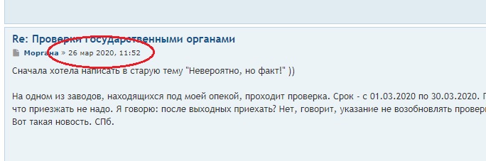 Добрый вечер! это что они задним числом что-ли документы по проверки оформляют ?Моргана писал(а): 26 мар 2020, 11:52 На одном из заводов, находящихся под моей опекой, проходит проверка. Срок - с 01.03.2020 по 30.03.2020.