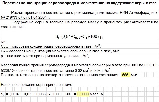 Затем надо посчитать содержание серы в топливе на рабочую массу в соответствии с письмом НИИ Атмосфера, исх. № 218/33-07 от 01.04.2004 г.