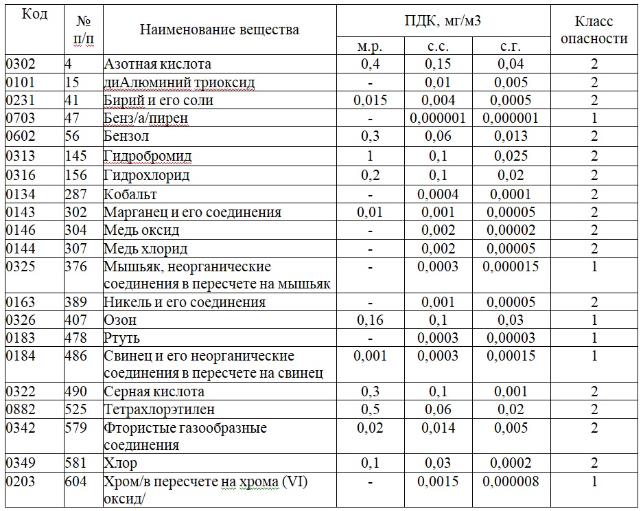 Провел небольшой анализ и включил в таблицу только вещества, у которых есть и ПДКсс и ПДКсг и что бы они были нормируемые (1316-р) и еще что бы класс опасности был 1 или 2. То есть это тот список, который актуален для ОНВ I и III категории опасности.