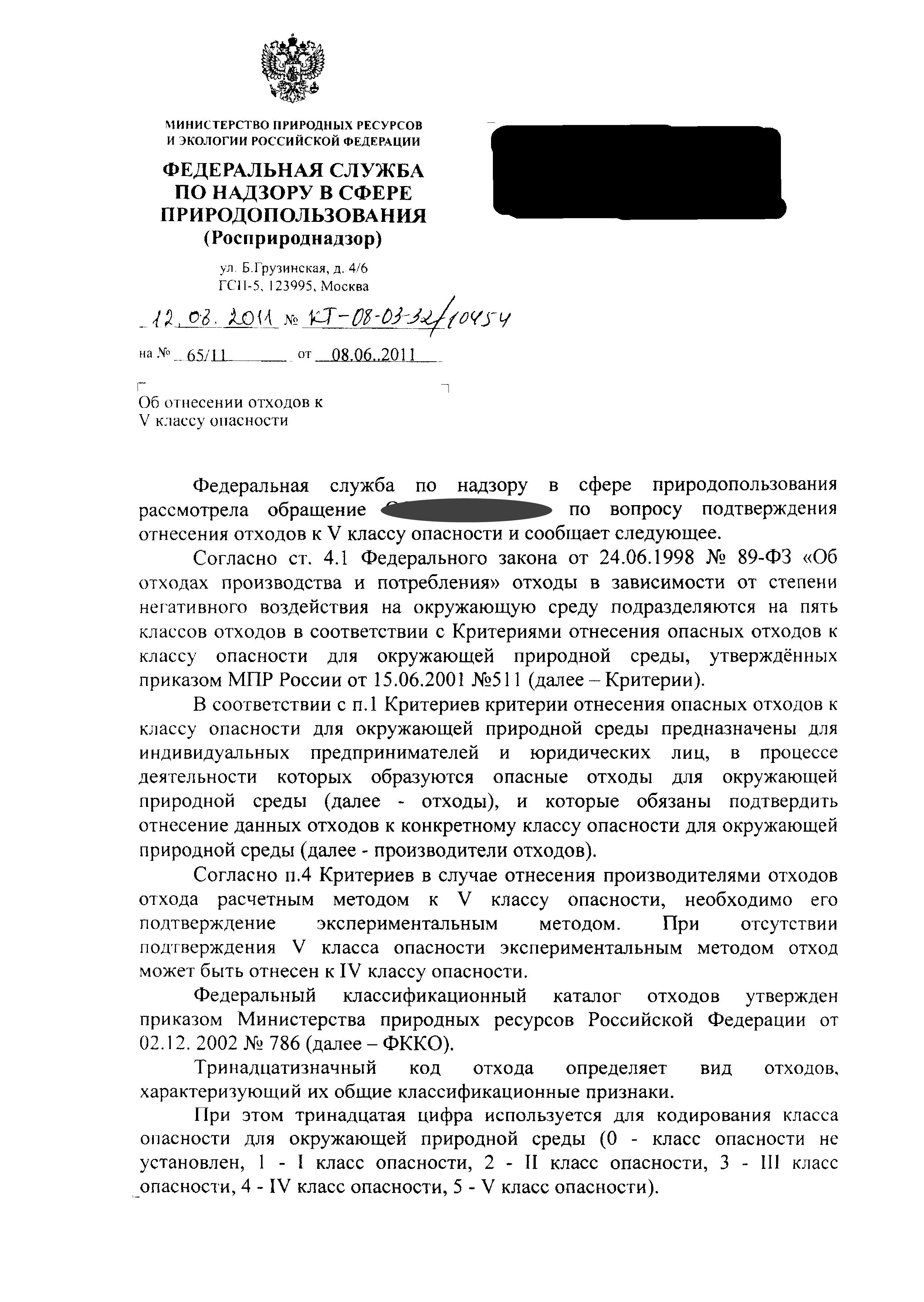 Коллеги, во вложении ответ Росприроднадзора на тот же запрос. Их позиция идентична МПР. Думаю, с этими письмами в руках теперь можно однозначно утверждать об отсутствии необходимости подтверждения отнесения отходов 5 класса опасности, включенных в ФККО, к указанному классу экспериментальным или расчетным методом.