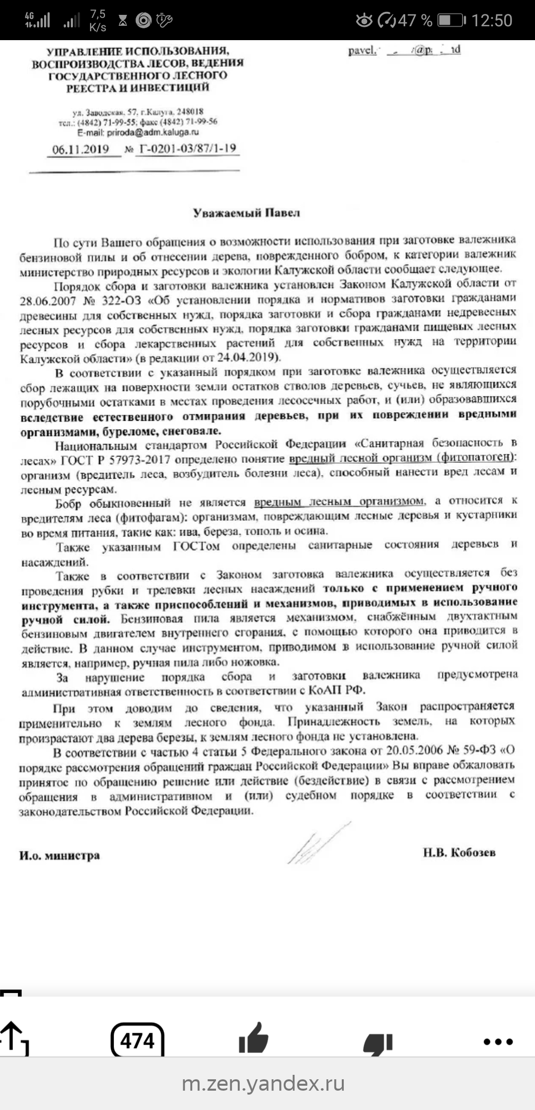 По сути Вашего обращения о возможности использования при заготовке валежника бензиновой пилы и об отнесении дерева, поврежденного бобром, к категории валежник министерство природных ресурсов и экологии Калужской области сообщает следующее.