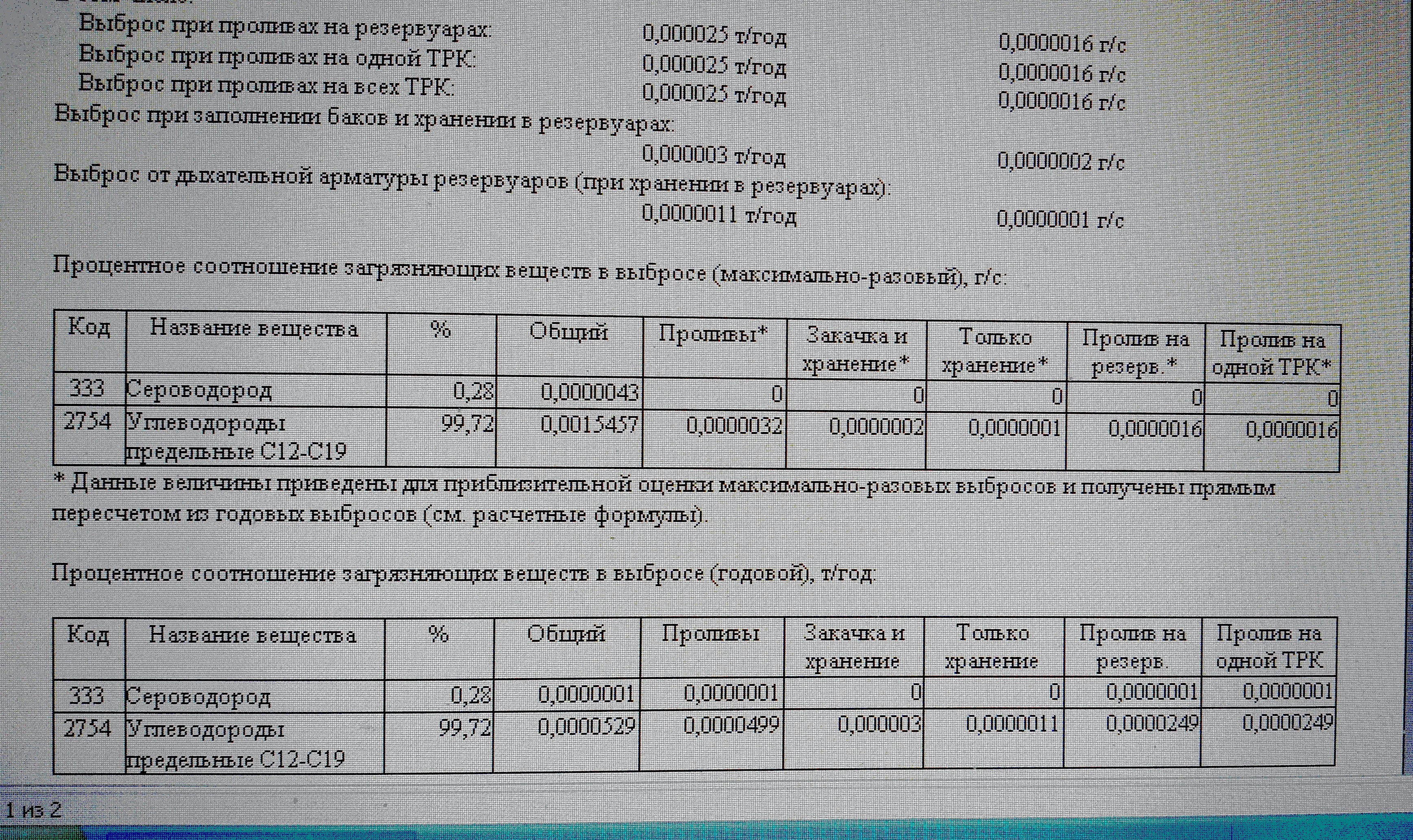 Добрый день. Подскажите. Есть резервуар с д/т в котором осуществляется хранение продукта. Закачка не производится уже как 5 лет (резервуар как резервное хранение). Считаю по программе АЗС. Данные заношу на закачку (рассматриваю вариант если будет такая необходимость) и хотела отдельно просчитать хранение. Но получается такая картина: при хранении рассчитывается только углеводороды, а сероводород = 0. Однако общий выброс цифра стоит, откуда она взялась, если везде нули по сероводороду (см. приложенный файл)?
