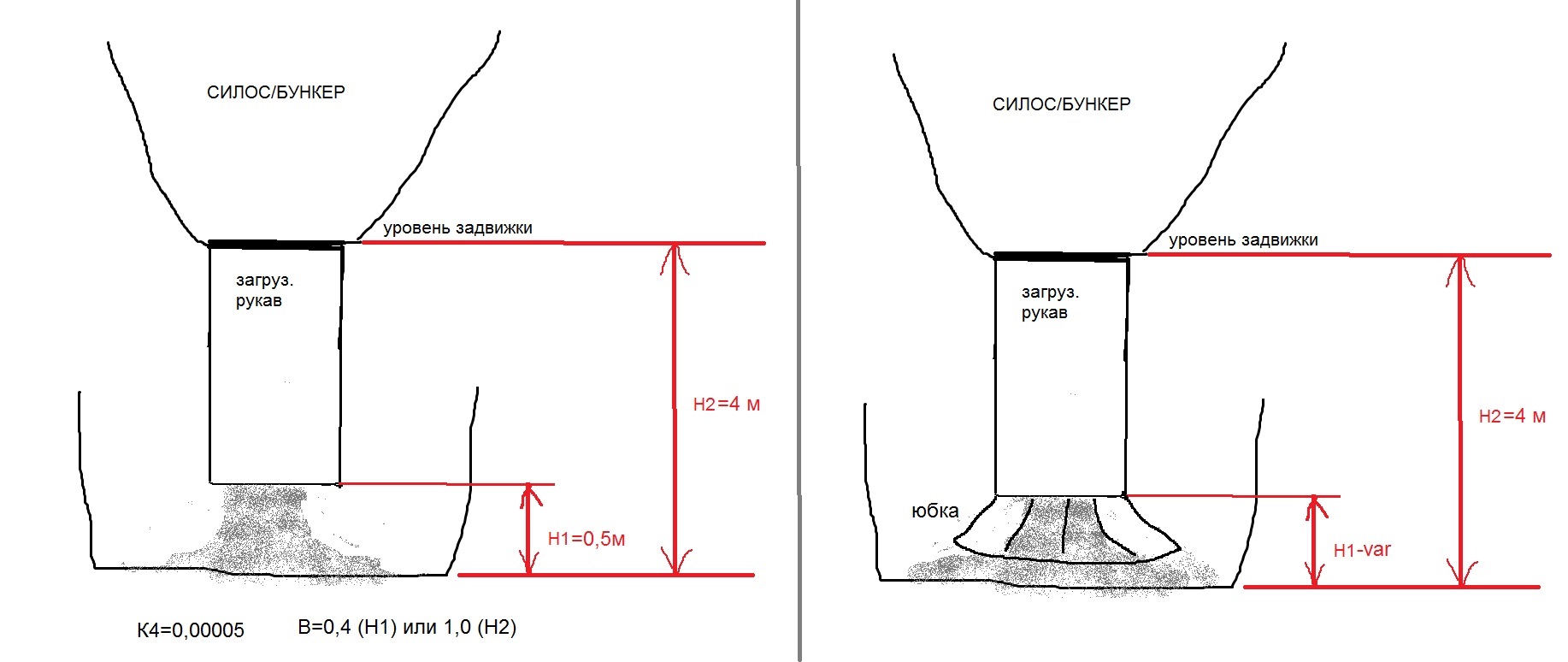 Коллеги, а какую высоту принимать при пересыпке с загрузочным рукавом? Высоту задвижки или высоту, где оканчивается рукав?