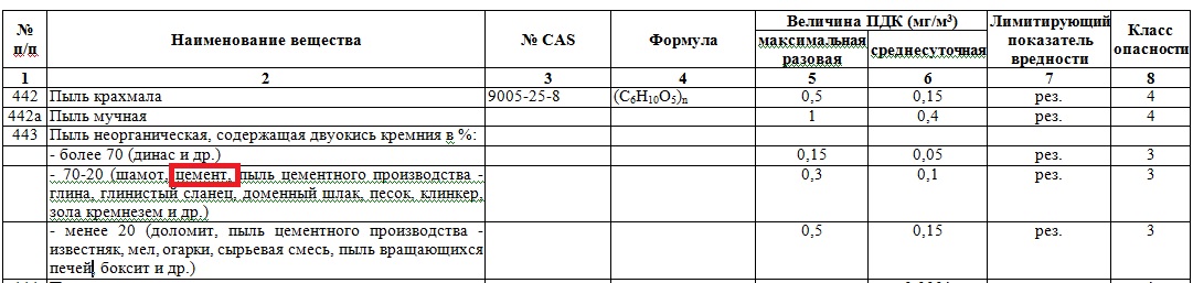 А вот по мнению главного государственного санитарного врача, в соответствии с ГН 2.1.6.1338-03 (зарегистрирован в Министерстве юстиции Российской Федерации (регистрационный номер 4679 от 11 июня 2003 г.)) - пыль цемента это все таки пыль неорганическая, содержащая двуокись кремния в %: 70-20