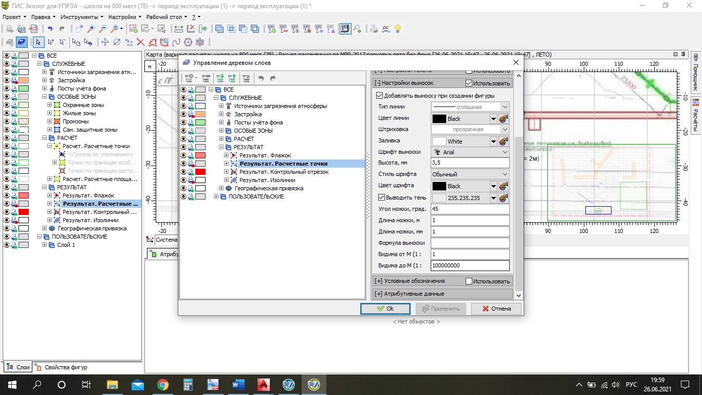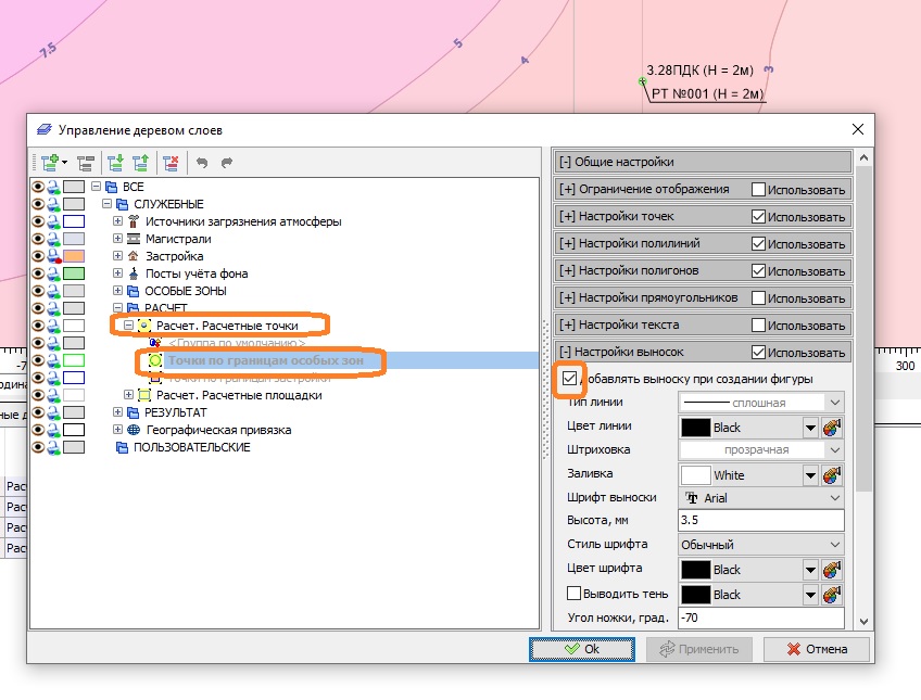 В управлении деревом слоем, необходимо для группы "РАСЧЕТ" - "Расчет. Расчетные точки" - "Токи по границам особых зон" поставить галочку "Добавлять выноску при создании фигур". Сохранить изменения и перезапустить "ГИС-Эколог".