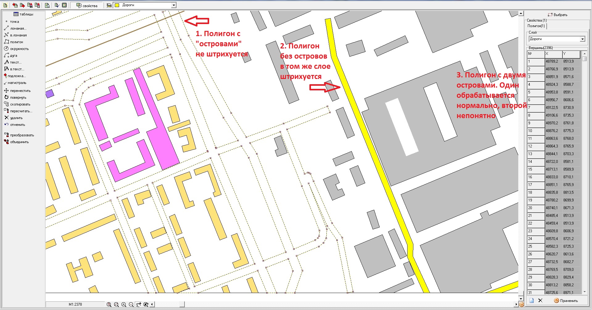 Векторизировал немного г. Красноярска, экспортировал в Экограф *.mif файлами, чтобы полигоны передавались полигонами, а не линиями. Экспортировалось все успешно, но многие объекты нарисованы в виде полигонов с "островами" и их Экограф не может корректно обработать, заштриховать в соответствии с настройками слоя. Можно ли как-то решить проблему? Начальство хочет желтые дороги и картинку вообще как на рисунке.