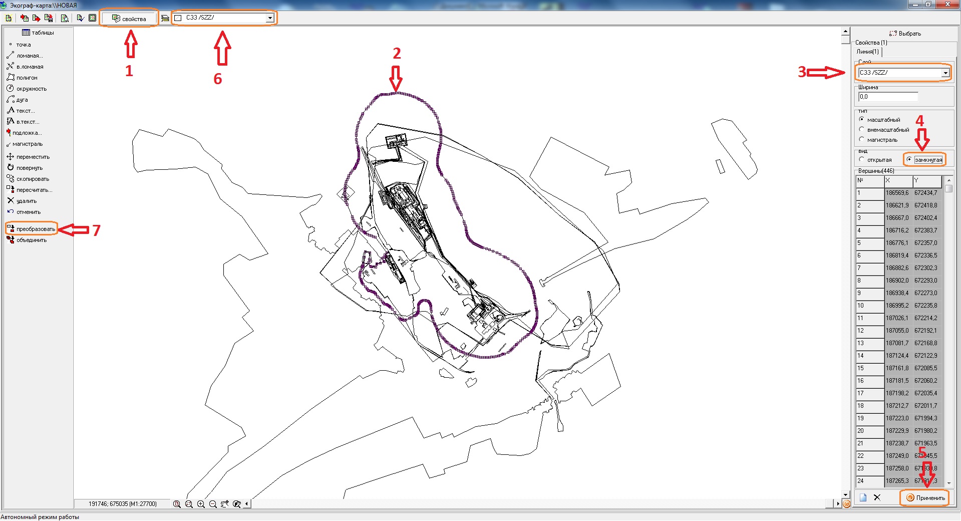 4. На левой панели жмем кнопку «Преобразовать» (7), по счету вторая снизу. Сохраняем. Теперь УПРЗА будет видеть эту зону как родную, может назначать на ней расчетные точки.