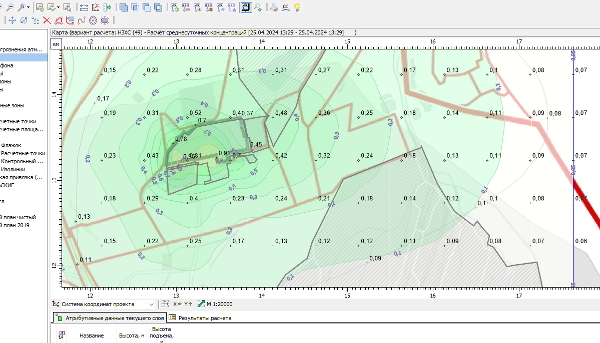Вы изменяли размеры расчетной площадки уже после проведения расчета рассеивания. Сейчас, чтобы убрать результаты из узлов прежней расчетной площадки, нужно заново произвести расчет рассеивания.