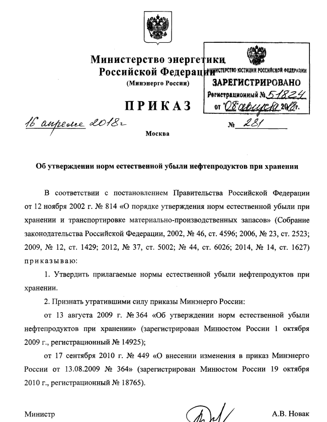 DDim, извиняюсь, имела в виду Приказ Министерства энергетики РФ от 16 апреля 2018 г. N 281 "Об утверждении норм естественной убыли нефтепродуктов при хранении"