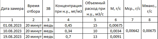 Сделали 3 пробы в разные дни (получено 3 концентрации + 3 значения объемного расхода ГВС; разные режимы работы ИЗАВ отсутствуют), занесли их в таблицу 2.1, рассчитали среднюю мощность выброса (столбец 13). Далее заполняем таблицу 3.2 и возникает вопрос -> Какие параметры объемного расхода следует в данном случае вносить в столбец с объемным расходом ГВС - средний из 3? - максимальный из 3 или как то иначе рассчитать? Тот же вопроси возникает и по скорости, т.к. они связаны.