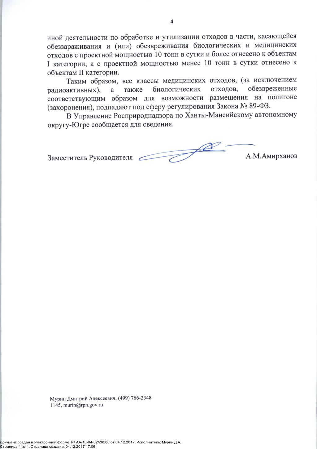 Письмо Росприроднадзора от 04.12.2017 № АА-10-04-32/65588 по вопросу нормирования отходов, образующихся при обезвреживании биологических и медицинских отходов.