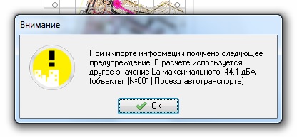 Подскажите, пожалуйста, в связи с чем программа "Эколог-Шум" 2.0.1.3868 "на ровном месте" выдает предупреждение: "При импорте информации получено следующее предупреждение: "В расчете используется другое значение La максимального: 44.1 дБА [объекты № 0001] Проезд автотранспорта]?