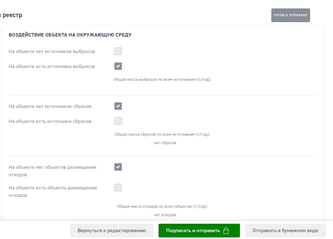 Только что зашла и проверила. Указала, что источники выбросов есть, но вообще ничего не заполняла про них. Вот - готов к отправке.