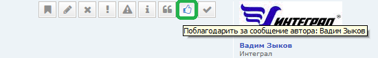 При расчете скидки учитываются благодарности, выраженные другими пользователями путем нажатия на кнопку "Поблагодарить за сообщение автора...": Посмотреть общий размер скидки можно в личном кабинете на сайте: Данный порядок предоставления скидок и их учета работает в тестовом режиме. Фирма "Интеграл" оставляет за собой право изменять порядок предоставления скидок.
