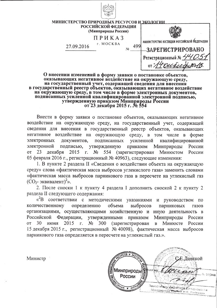 Приказ Минприроды России от 27.09.2016 № 499 «О внесении изменений в приказ Минприроды России от 23.12.2015 № 554 «Об утверждении формы заявки о постановке объектов, оказывающих негативное воздействие на окружающую среду, на государственный учет, содержащей сведения для внесения в государственный реестр объектов, оказывающих негативное воздействие на окружающую среду, в том числе в форме электронных документов, подписанных усиленной квалифицированной электронной подписью»»позволит сделать ряд конкретных шагов по организации сбора сведений об объеме выбросов парниковых газов, которые будут использованы при формировании государственной политики по регулированию выбросов парниковых газов.