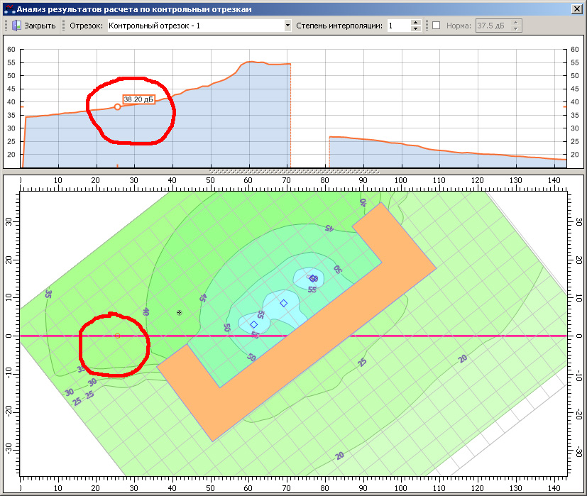 Теперь карта контрольного отрезка строится следующим образом. Окно просмотра делиться на две области. Внизу показывается карта-схема, на которой виден построенный контрольный отрезок. В верхней области показывается график распределения звукового давления вдоль контрольно отрезка.
