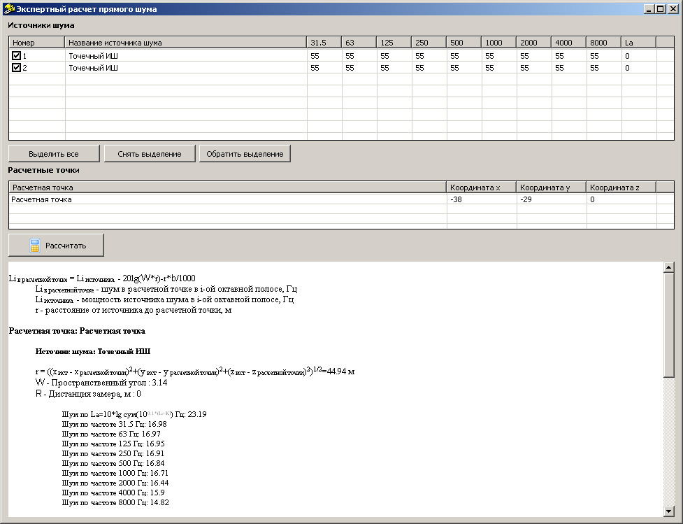Есть экспертный расчет, в котором производится расчет прямого шума для конкретной расчетной точки от каждого источника шума.