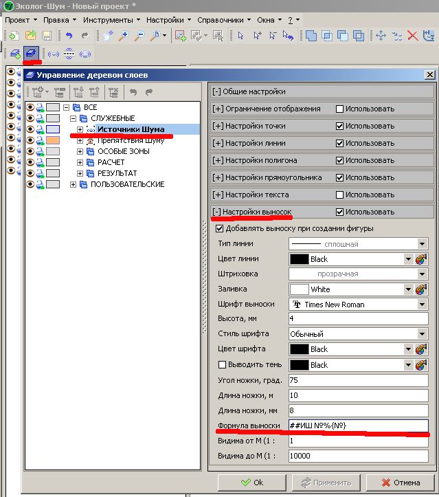 "Вентилятор (La = 86дБ) Если вы хотите отредактировать формулу выноски не для конкретной фигуры, а сразу для всех фигур, которые будут строиться в конкретном слое, то нужно будет зайти в окно "Управление деревом слоев", выбрать нужный слой и в правой части окна изменить формулу для выноски.