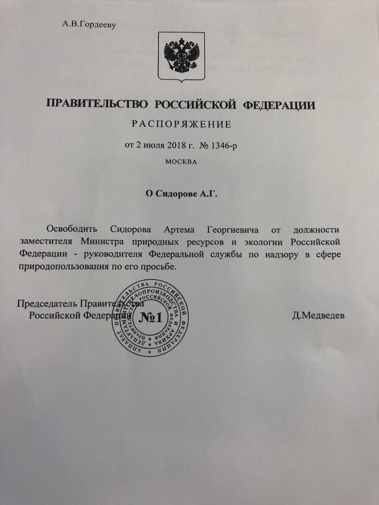 Премьер-министр Дмитрий Медведев подписал 2 июля распоряжение об отставке замминистра природных ресурсов, руководителя Росприроднадзора Артема Сидорова "по его просьбе". У РБК есть копия распоряжения, представитель главы Минприроды Наталья Хлопунова подтвердила, что такой документ подписан. По ее словам, исполняющим обязанности руководителя Росприроднадзора назначен Амирхан Амирханов.