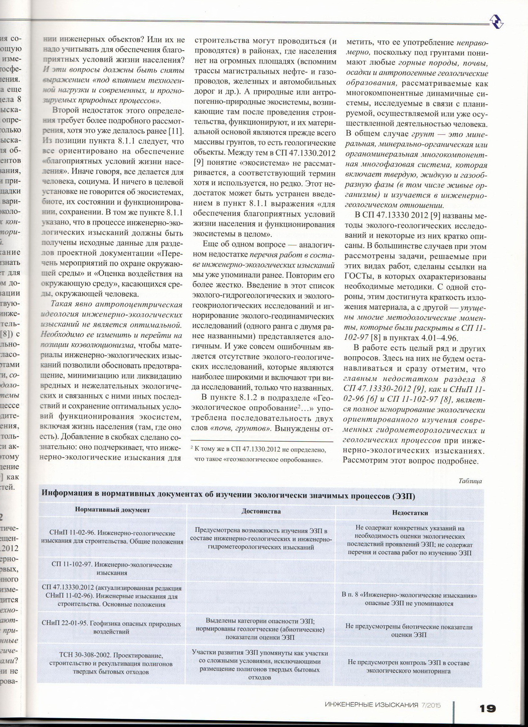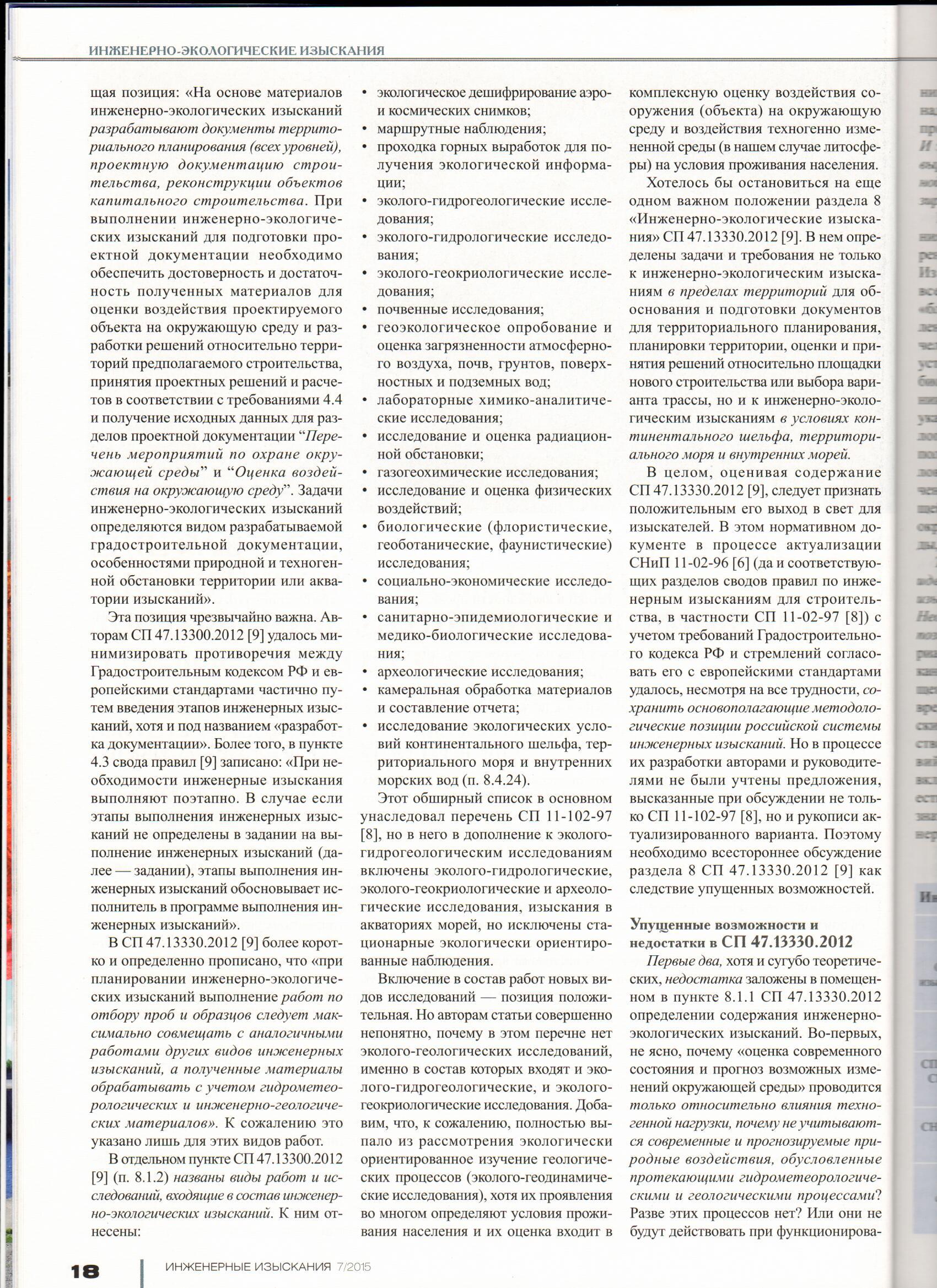 По поводу статьи: мое мнение - это очередная статья-мнение теоретиков. Согласна с тем, что в СП 47.13330-2012 много упущено, но есть и лишнее, есть дублирующие разделы - документ разработан как будто в спешке, необдуманно (лишь бы было). Этот актуализированный СП и СП 11-102-97 в настоящее время переданы АИИС в переработку и разработку, надеюсь, изыскатели с опытом разработают грамотный документ нам в помощь, а не в проблемы