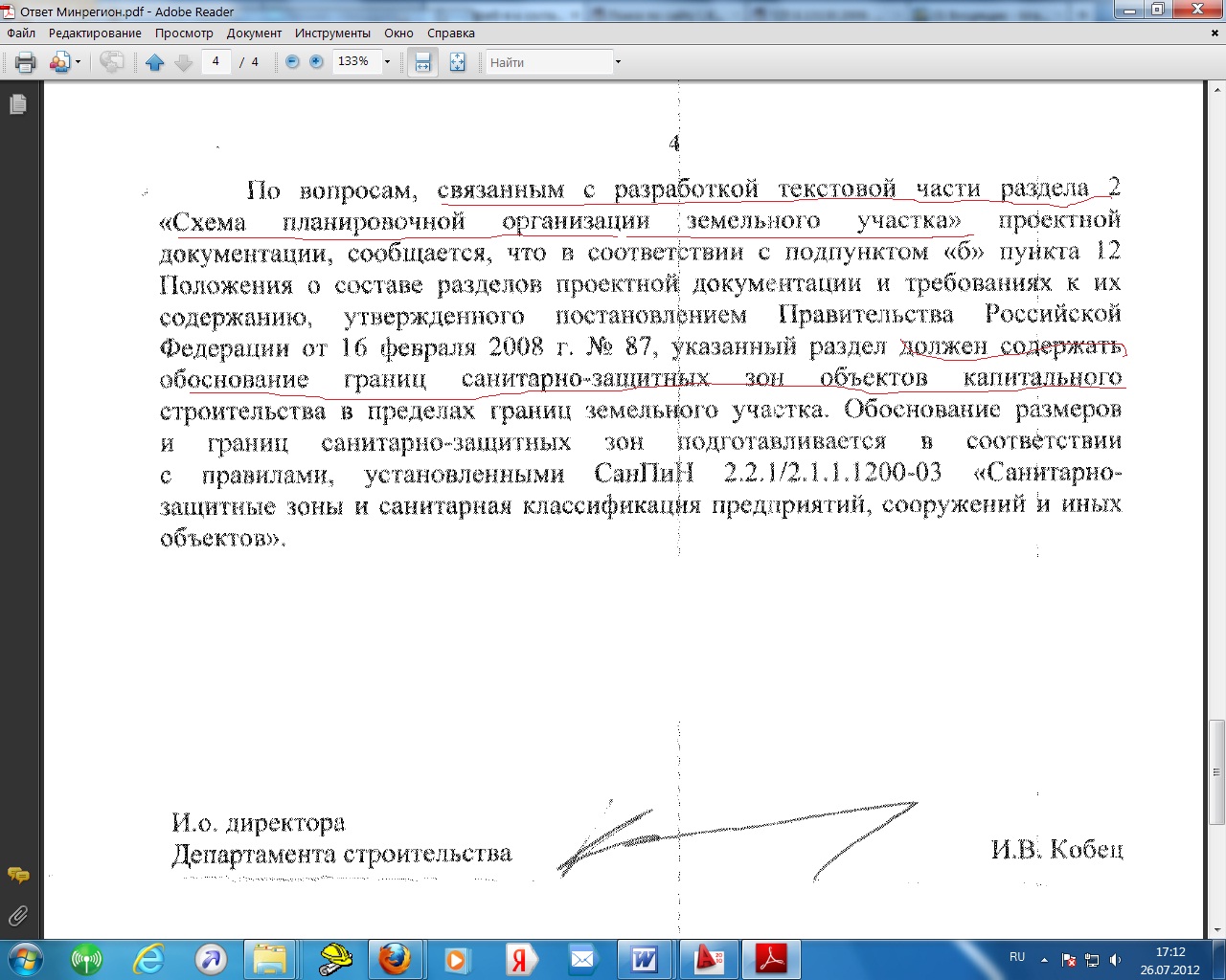 Минрегион ответил на первую часть, а тему "правового определения и понятия, состава и содержания «обоснования границ СЗЗ» обоснования границ СЗЗ объекта капитального строительства»" проигнорировал.6) содержания требования подпункта б) п.12 «обоснование границ СЗЗ объекта капитального строительства в пределах границ земельного участка – в случае необходимости определения указанных зон в соответствии с законодательством РФ», а также правового определения и понятия, состава и содержания «обоснования границ СЗЗ» обоснования границ СЗЗ объекта капитального строительства»