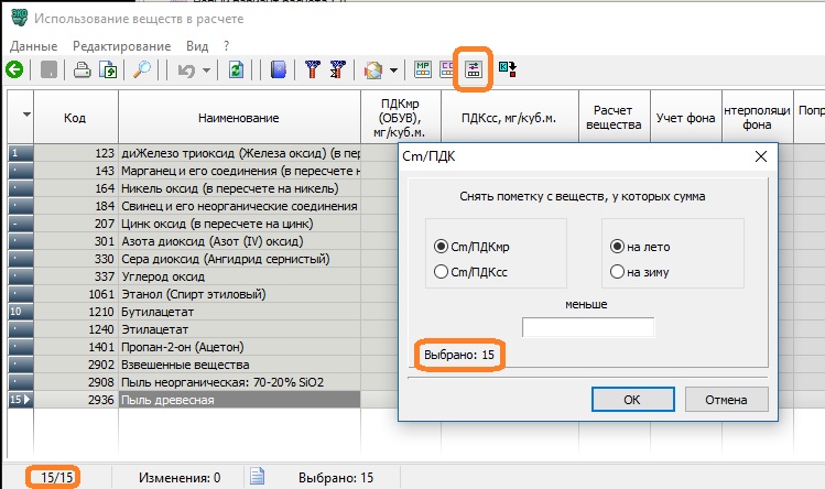 Здравствуйте! Пытаюсь воспользоваться управлением выбором веществ для расчета рассеивания (Эколог 4.60.2, вариант расчета). Не удается снять пометку у веществ, для которых См/ПДК< 0.1 (таких веществ 17 из общего количества 35). С чем это может быть связано?