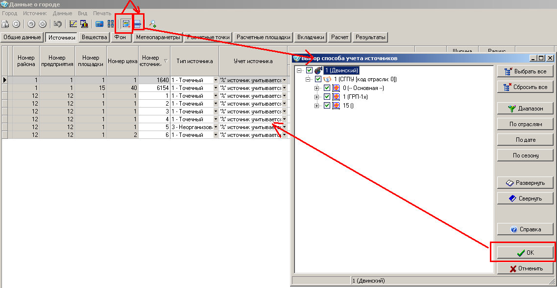 Учет источника в расчете можно задать на вкладке "Источники" карточки "Данные о городе".