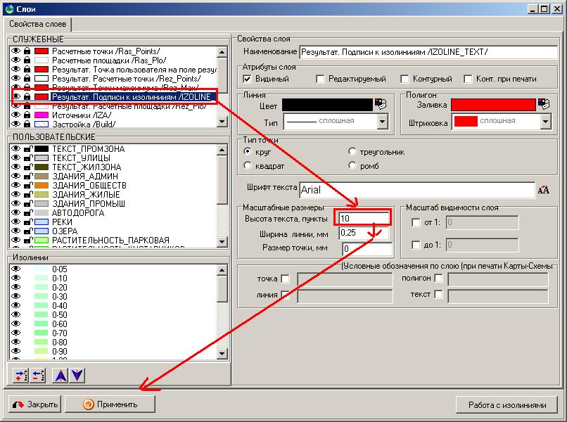 Толщина изолиний настраивается в графическом модуле УПРЗА "Эколог". Кнопка "Настройка слоев" (изображено три слоя один над другим). В поле "СЛУЖЕБНЫЕ" выбираем слой "Результат. Подписи к изолиниям /IZOLINE/" и выбираем настройку "Ширина линии, мм" (в правой части экрана). Изменяем этот параметр, переводим курсор мыши, предположим в поле "Высота текста, пункты" и нажимаем кнопку "Применить" (нижний левый угол окна).
