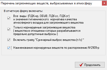 - возможность формирования таблиц "Перечень загрязняющих веществ,..." и "Нормативы выбросов...по объекту ОНВ" с названиями веществ по распоряжению 2909-р;